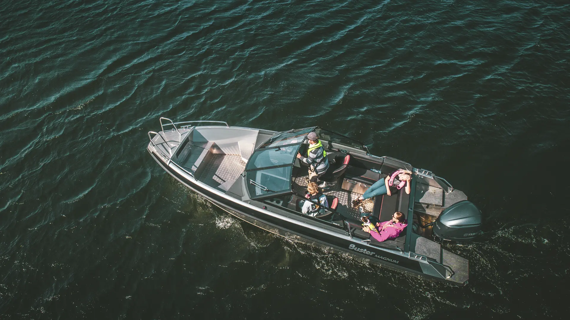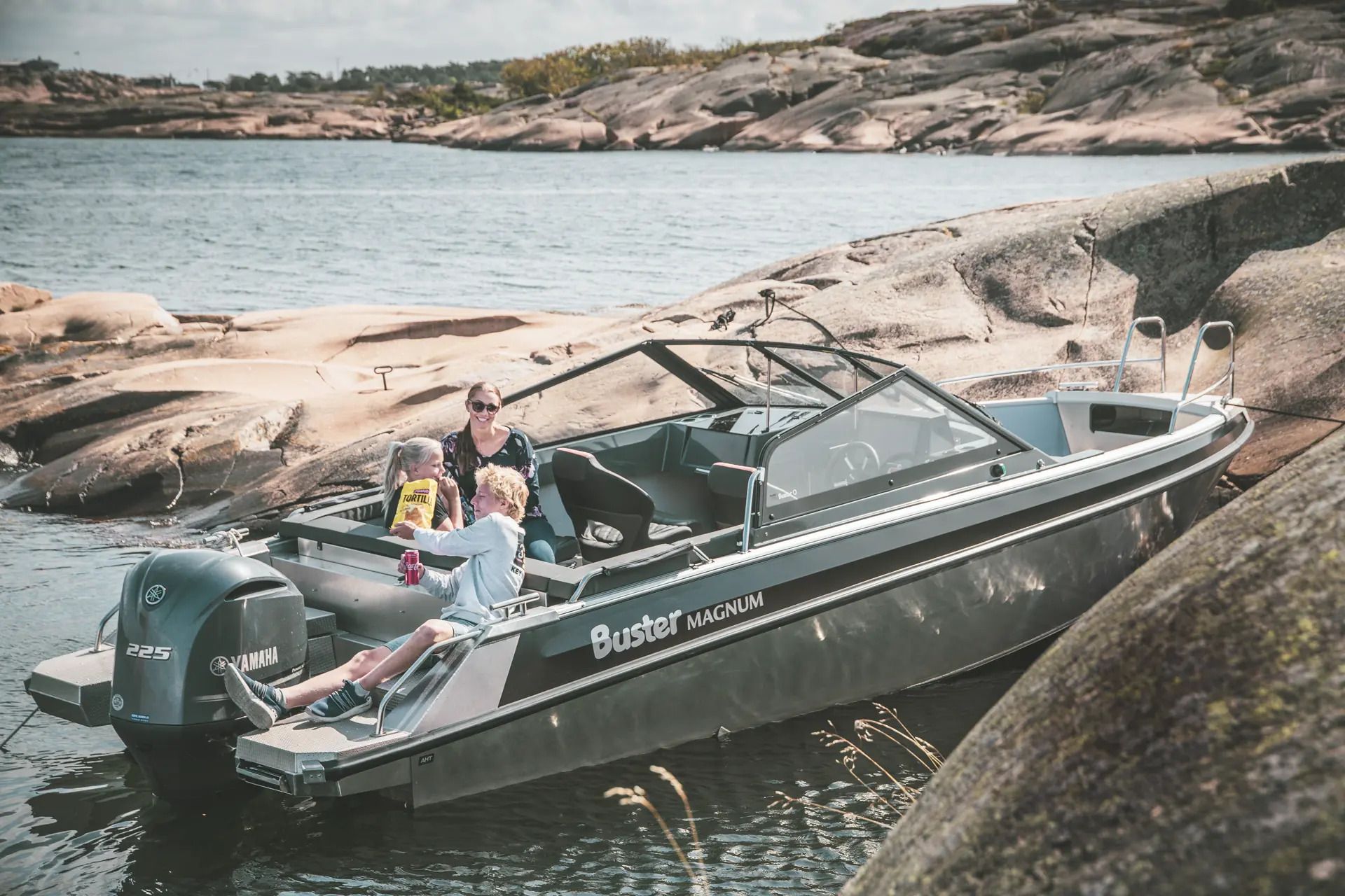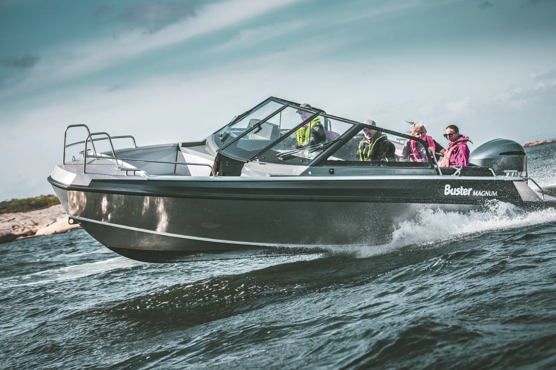 En annen merkbar detalj er at Buster rendyrker aluminiumskonseptet, uten at båten blir mindre familievennlig av den grunn. Ny vindskjerm med tydeligere profiler og et design med tøffere uttrykk bidrar til å gi båten moderne linjer. Plastdetaljene vi så mer av i forrige utgave er borte – og både dørken og konsollen er nå i aluminium. Magnum er en bow rider med vindskjerm, som gir bedre beskyttelse for vind og sjøsprøyt. Samtidig har den et par sitteplasser i baugen. Det gir også mulighet for kalesje, og den finner sted i en romslig kalesjegarasje akterut og kneppes raskt på.