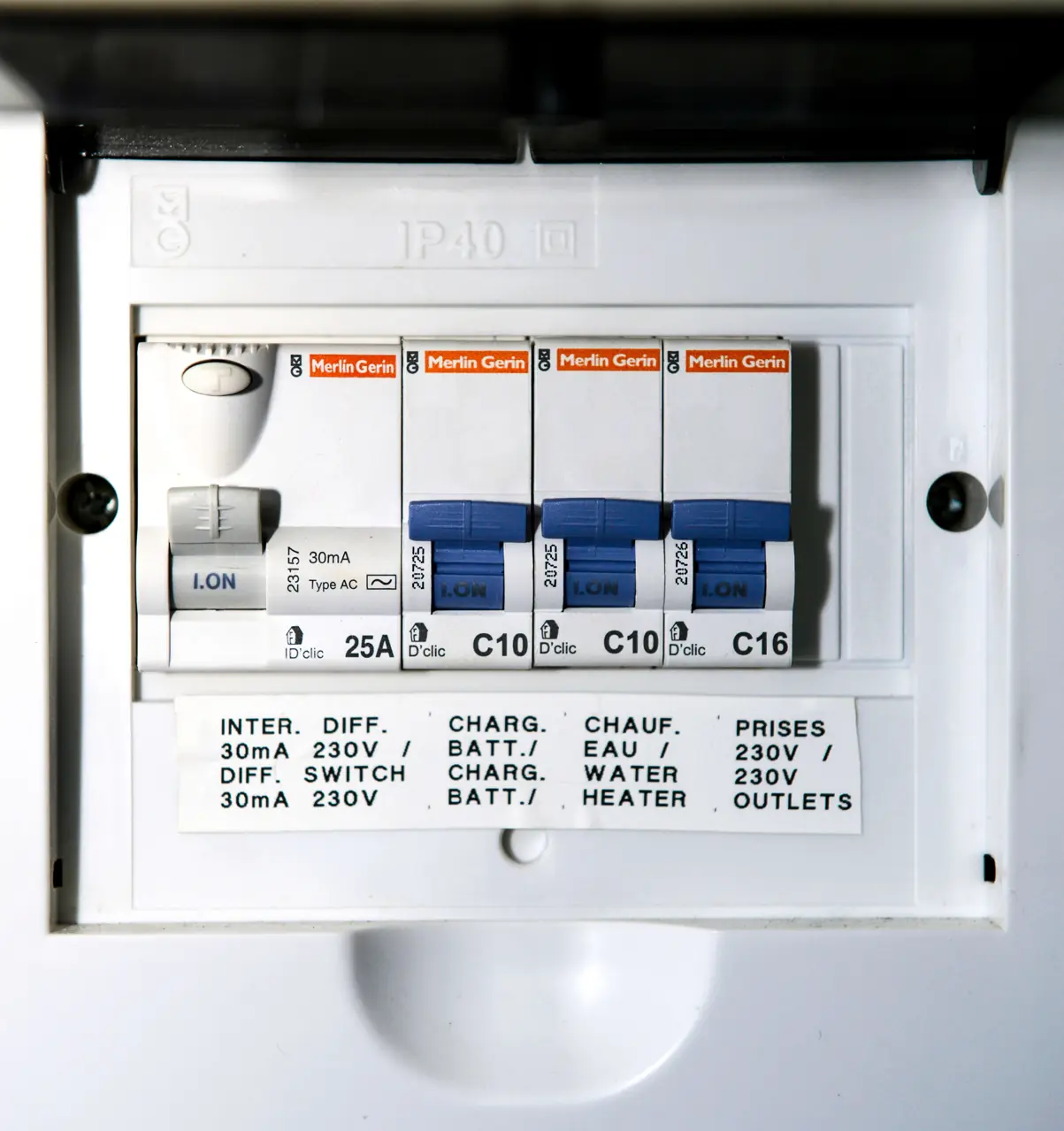 SIKRINGSBOKSEN: Dette er en typisk sikringsboks i båt. Det er uttak til ulike kurser, samt innebygget jordfeilbryter. Ved overbelastning eller kortslutning ryker sikringene. Ved overledning slår jordfeilbryteren ut. Uansett mister man strømmen om bord.