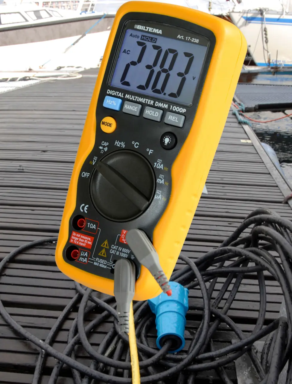 MÅLE SPENNING: Du kan måle spenningen. Ideelt sett skal den være mellom 220 og 240 volt. Er spenningen lavere enn rundt 200 volt bør du melde fra om det. Spenningen måles med et voltmeter/multimeter, som alle bør ha om bord.