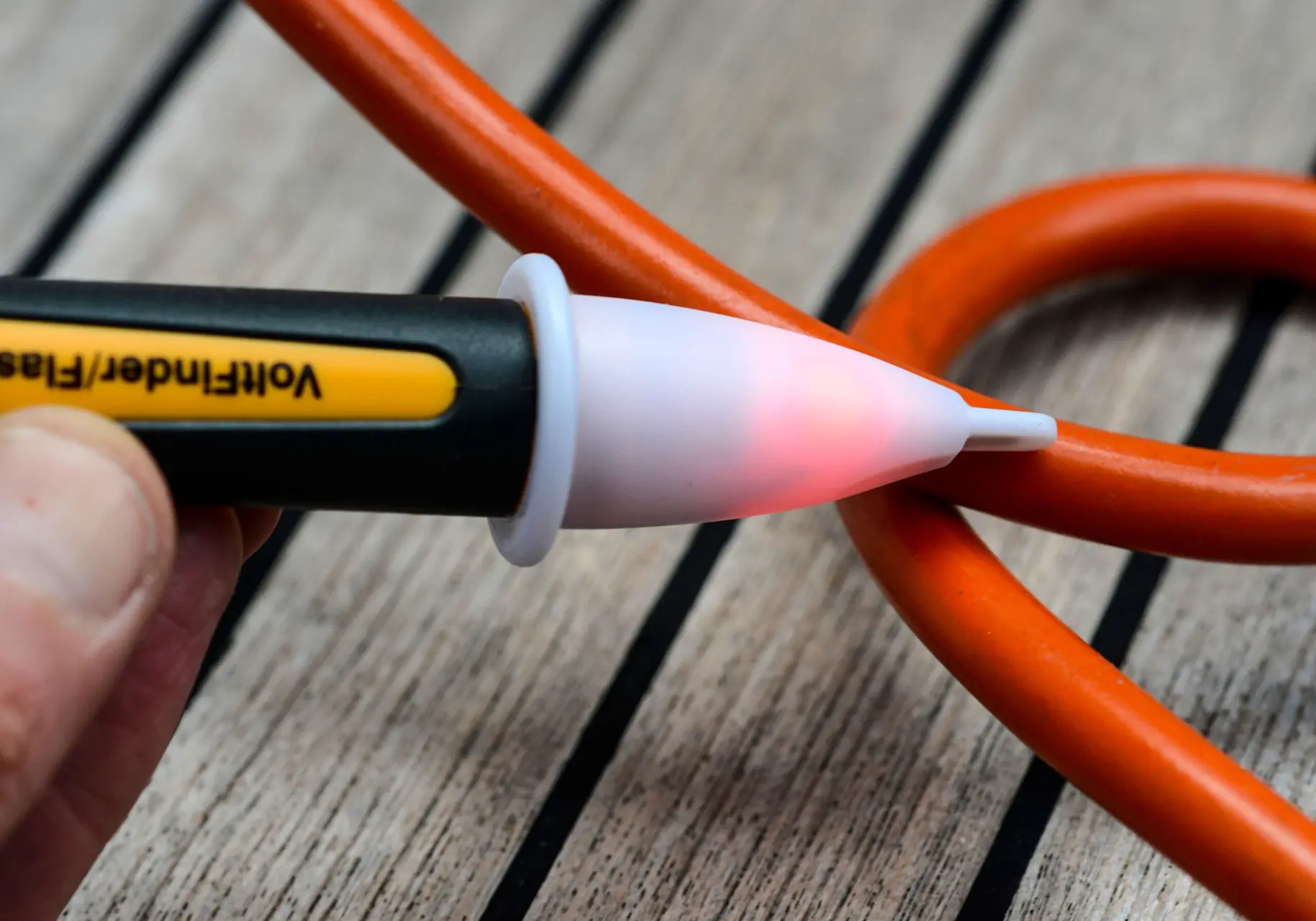 - Det er veldig greit å ha en spenningsdetektor. Ser ut som en liten lykt. Den viser med rød diode om det er strøm bare ved å holde den mot kabel eller kontakt. Rimelig, enkelt og ingen fare for å få støt.