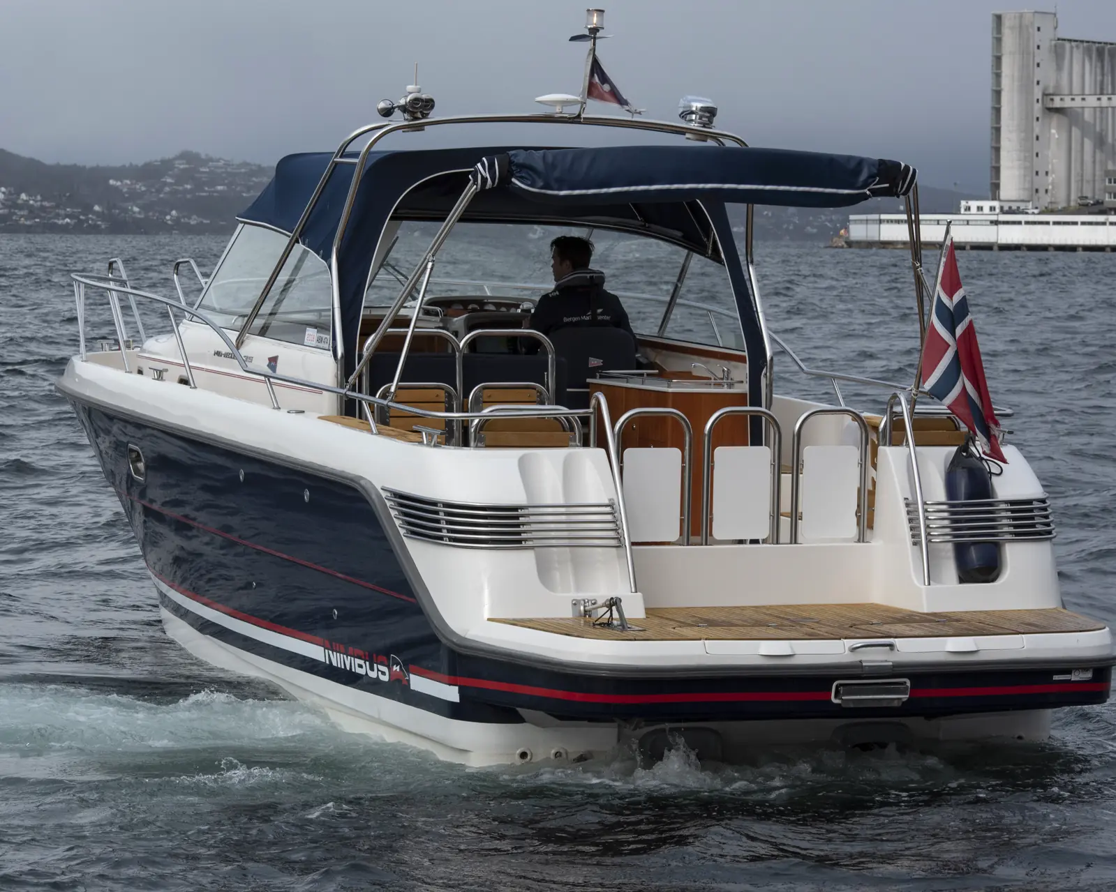 Sjøegenskapene oppleves som fremragende, og det er en fryd å føre denne båten. Det oser av Nimbus-kvalitet og båten føles veldig tight og solid. Her er det ingen ting som skramler og støynivået er lavt. Med 520 hester under dørken er det krefter nok i massevis, båten oppleves både potent og viril. Med baugtrøster, to motorer og drev er det dessuten en enkel båt å håndtere.