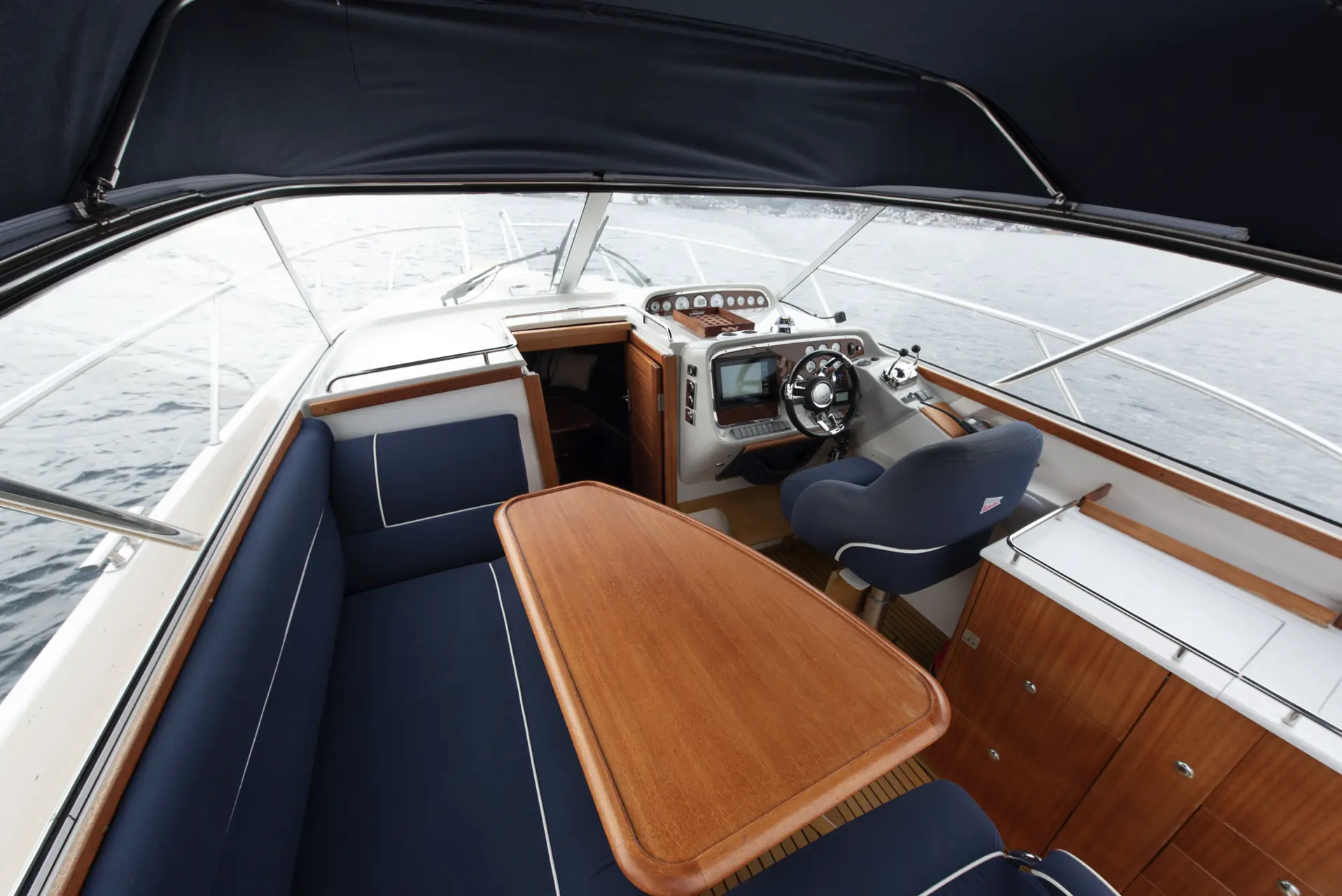 Det er et enkelt førersete med gode reguleringsmuligheter. Bak førerplassen, på styrbord side, er det langsgående bysse av det enkle slaget. To gassbluss, en liten vask med blandebatteri og litt skapplass innbyr ikke til avansert kokkelering, men duger for kaffebrygging og enkle måltider. På motsatt side er det en ganske raus L-salong som også kan brukes som solseng. I benken er det integrert et 65 liter kjøleskap.