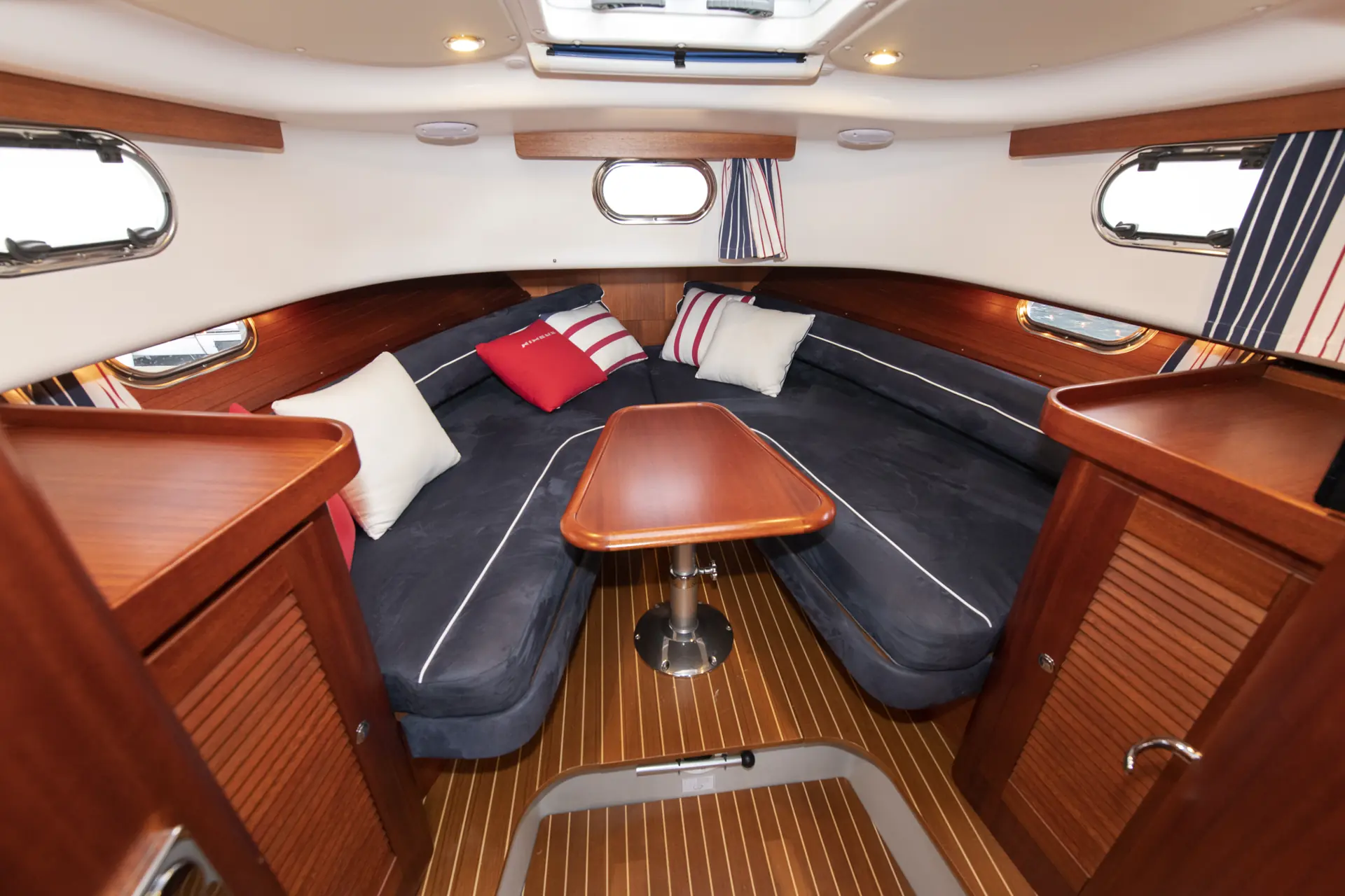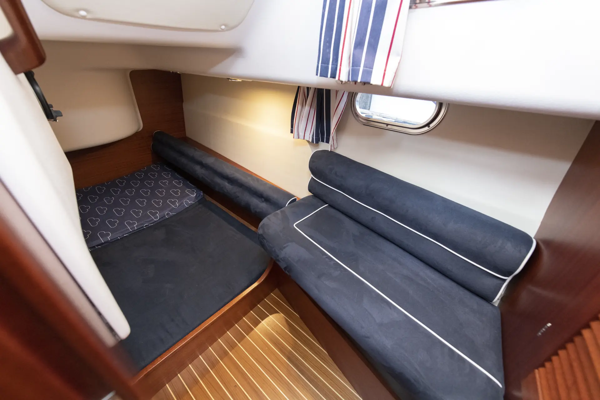 Forpiggen er en lun, liten hule som oppleves riktig trivelig. Senker man bordet kan V-sofaen enkelt gjøres om til køye. Fra forpiggen er det inngang til side/midt-lugaren som byr på sittebenk og en forbausende romslig dobbeltkøye. På motsatt side er det et fint toalettrom, hvor man også kan dusje om man er nøden på en kroppsvask. Det er rikelig med interiørbelysning og flere 230 volt uttak.