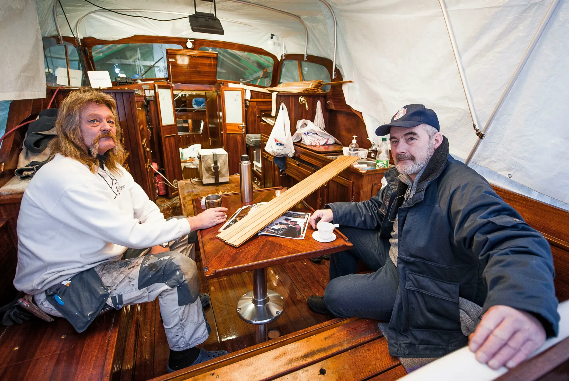 – Vi må stikke bortom han Jan, sier Trond og viser vei til presenningsteltet et stykke borte blant nedpakkede, store motorbåter. Og vips, så befinner vi oss under pressing og dekk på en Furuholmen 33 fra 1964. Kjøpt etter selvsyn på trebåtfestivalen i Halden, forklarer eier og sjefsoppusser Jan Flemming Hansen.