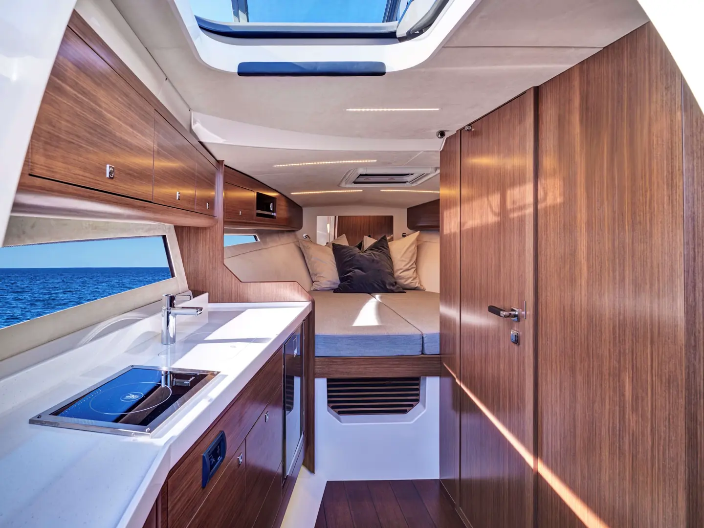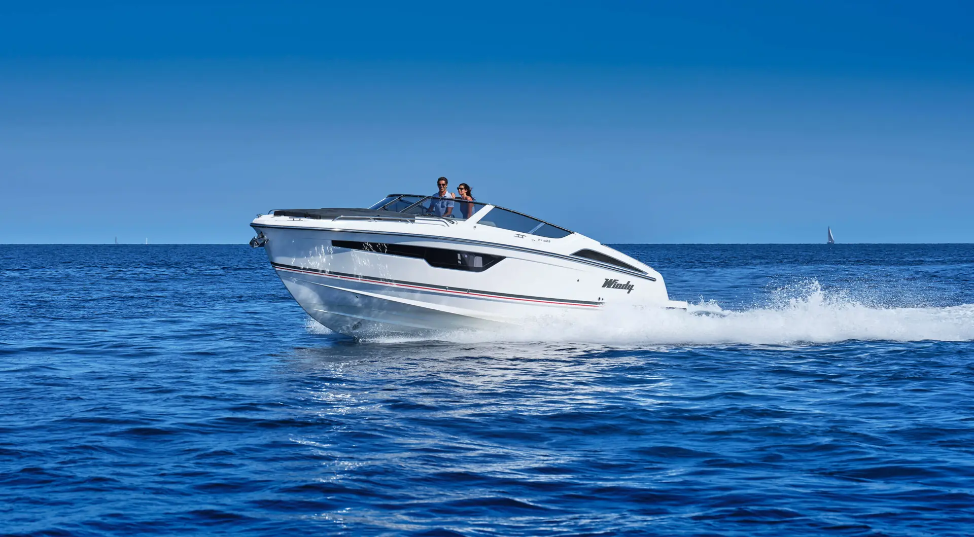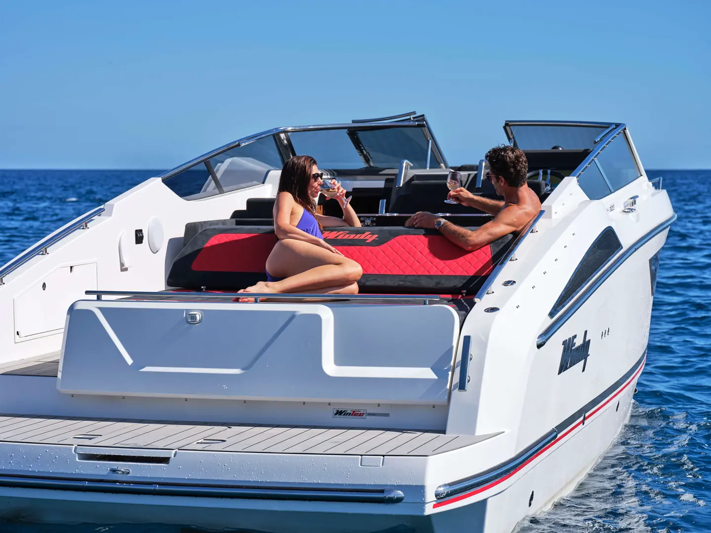 Båten har fått et romslig bad med separat dusj, en stor midkabin med to eller tre soveplasser, pentry og ikke minst en særdeles behagelig uteplass for sosiale båtturer. Og det hele i et moderne, slankt og linjelekkert Windy-uttrykk og -design. Båten har fått en stor badeplattform med enkel passasje til cockpit. Her er en bred solseng, sittegruppe med tilhørende, elektrisk senkbart bord og tre separate stoler i fartsretning.