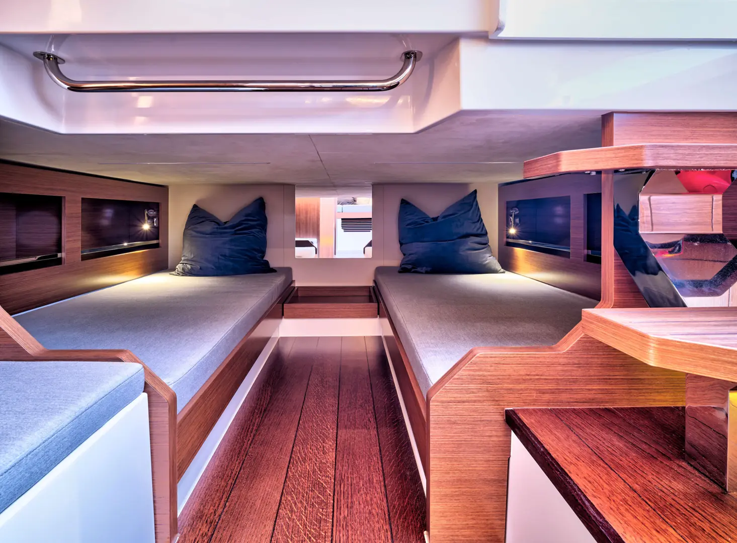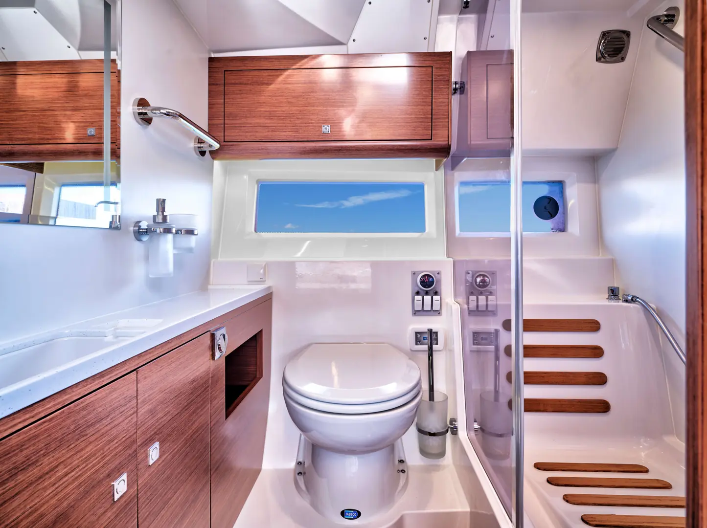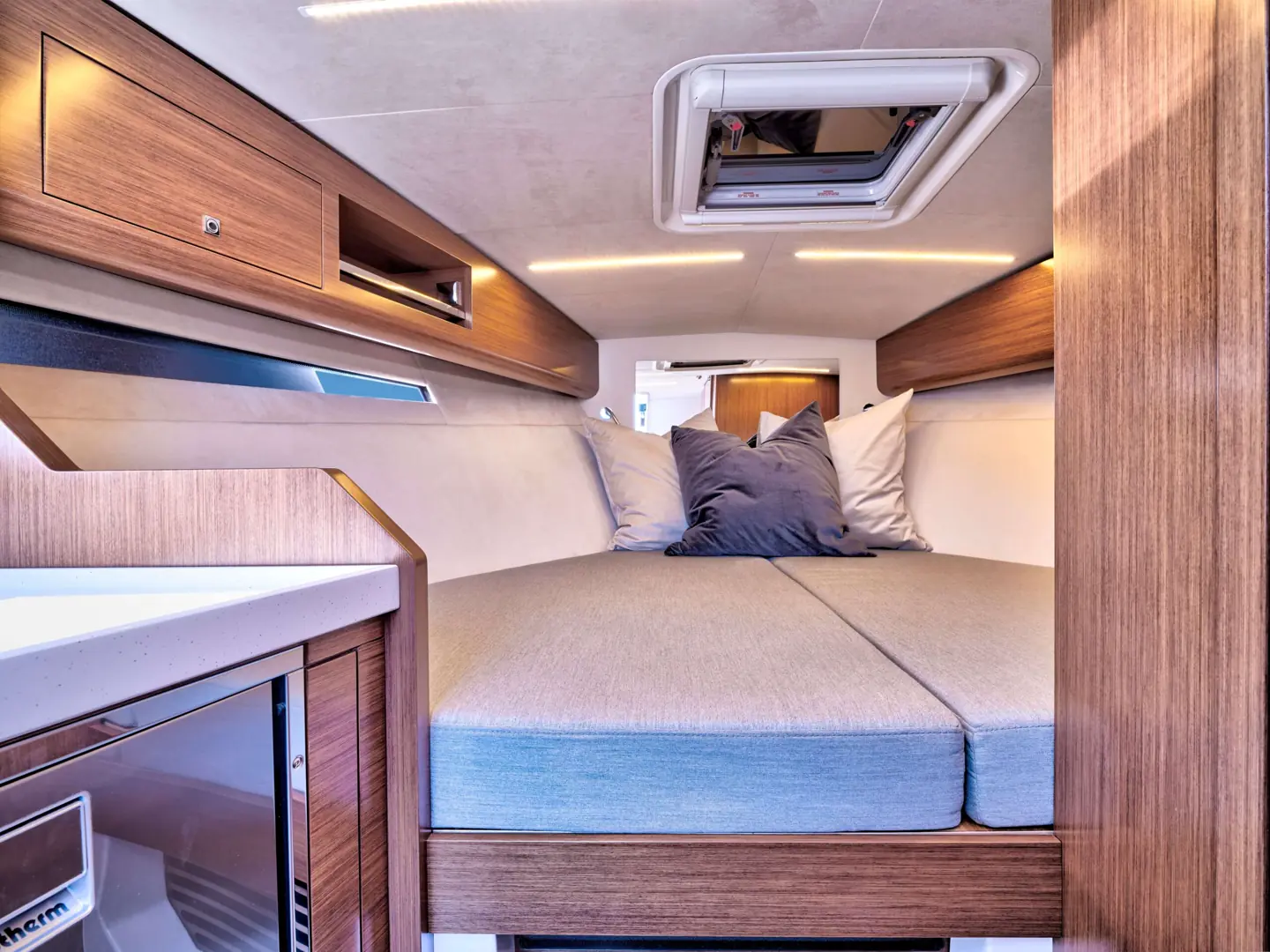 Båten har fått et romslig bad med separat dusj, en stor midkabin med to eller tre soveplasser, pentry og ikke minst en særdeles behagelig uteplass for sosiale båtturer. Og det hele i et moderne, slankt og linjelekkert Windy-uttrykk og -design. Båten har fått en stor badeplattform med enkel passasje til cockpit. Her er en bred solseng, sittegruppe med tilhørende, elektrisk senkbart bord og tre separate stoler i fartsretning.